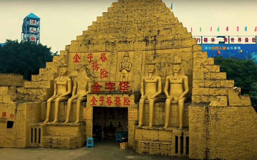 An outdoor amusement park in Chongqing, China, features this “pyramid adventure,” as the Chinese characters inform us.