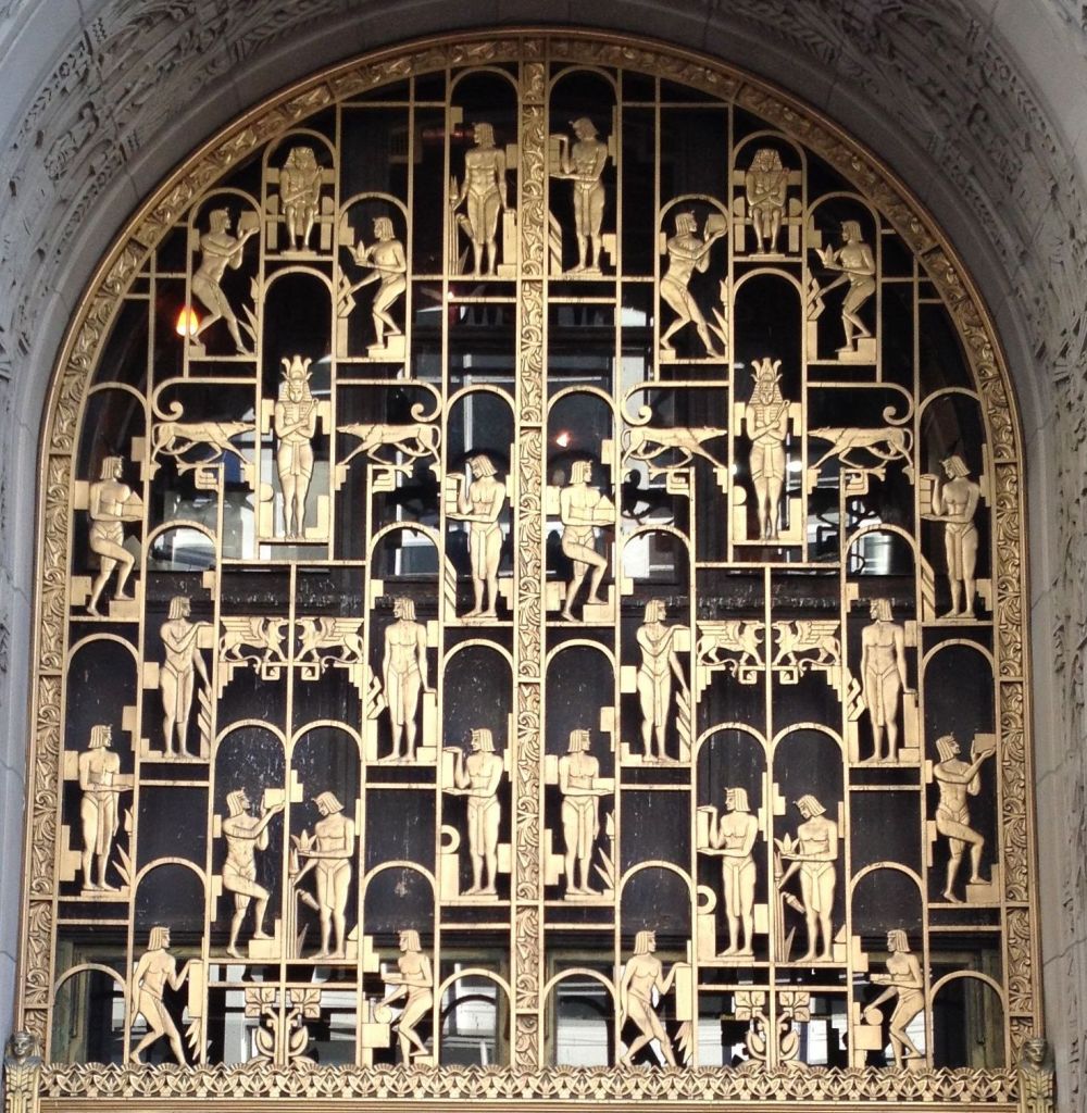 Ancient Nile Valley style figures adorn the design above the front doors of the Circle Tower office building, completed in 1930 and located in downtown Indianapolis, Indiana.