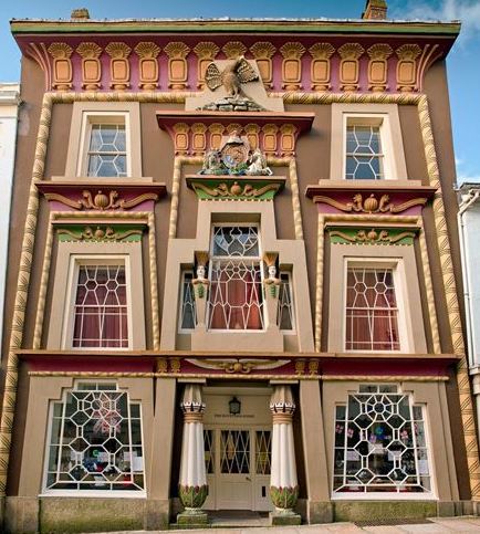 The Egyptian House in Penzance, England, currently ground-floor shops and upper-floor dwellings, dates to the mid-1830s.
