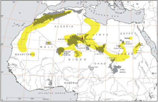 Map of the Sahara showing the main mountain systems (in grey) and the major rock art concentrations (in yellow). Credit: Marina Gallinaro, “Saharan Rock Art:Local Dynamics and Wider Perspectives,” Arts 2(4), 2013, https://doi.org/10.3390/arts2040350