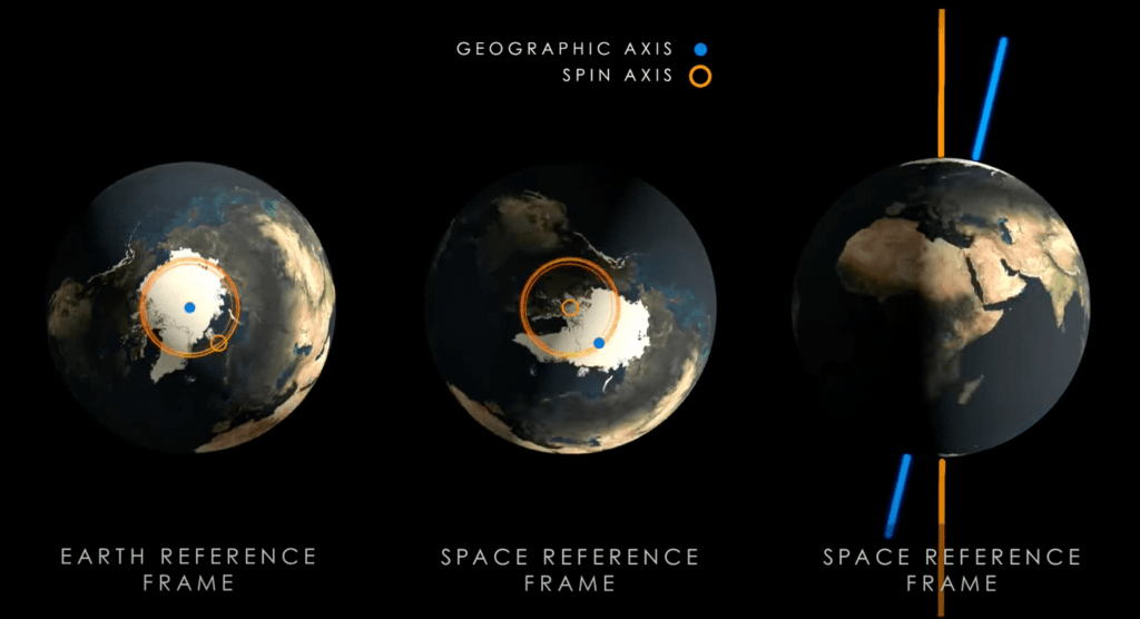 The spin axis that the Earth rotates around is shown in orange. The geographic north and south poles are shown in blue. When viewed from space, the geographic poles appear to “wobble” or spin away from the spin axis and then back again. Note: The size and speed of the spiral are greatly exaggerated for clarity. Video credit: NASA/GSFC Science Visualization Studio. Source with video: American Geophysical Union