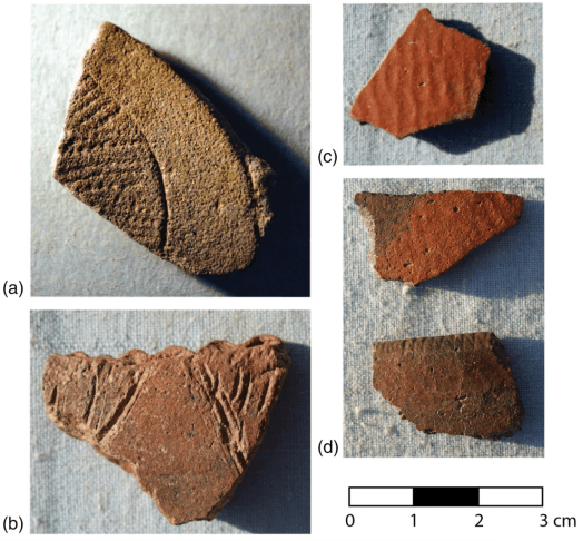 Neolithic and Pre-Kerma pottery from Ginefab. (a) Calceiform beaker with stamped motif; (b) bowl rim with modeling and incised triangles; (c) ripple ware; (d) blacktopped red ripple ware and polished with milled rim (photos by Stuart Tyson Smith). Credit: Shayla Monroe, Stuart Tyson Smith, and Sarah B. McClure, “Pastoralism, hunting, and coexistence: Domesticated and wild bovids in Neolithic Sudan,” International Journal of Osteoarchaeology, 33(3), 2023, https://doi.org/10.1002/oa.3223
